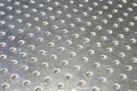 Aço galvanizado perfurado com orifícios circulares ou quadrado/losango sobre cimento cinza.